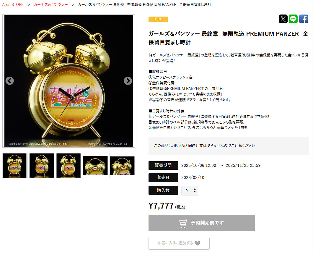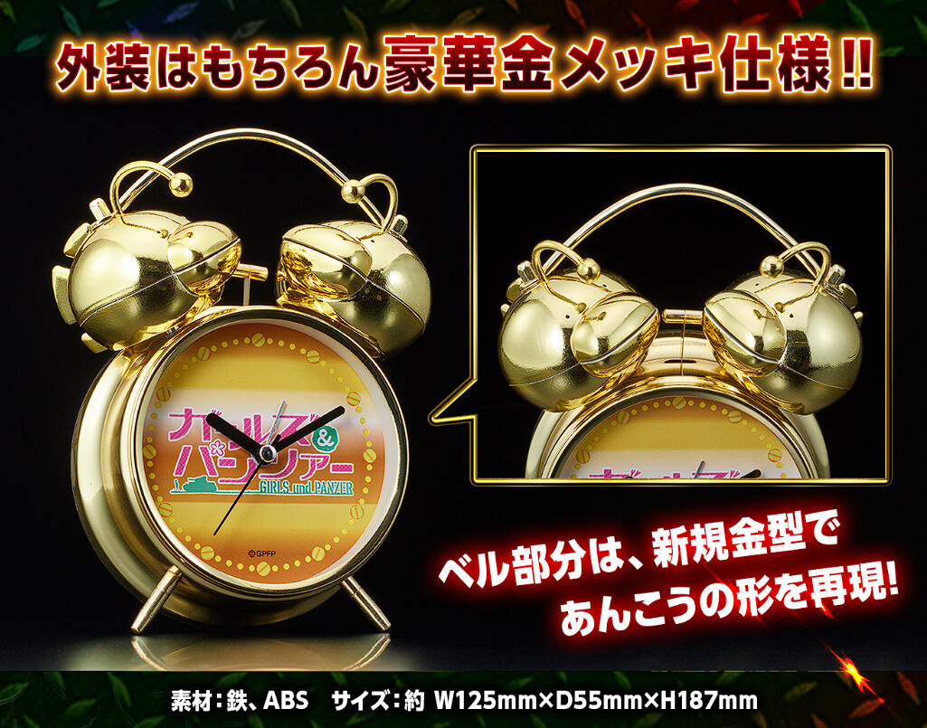 『eガールズ&パンツァー 最終章』の登場を記念して、戦車道RUSH中の金保留を再現した金メッキ目覚まし時計が登場‼️