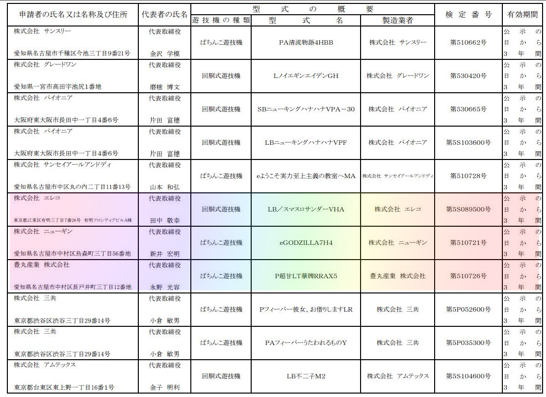 【新台】「LB/スマスロサンダーVHA(エレコ)」「P超甘LT華牌RRAX5(豊丸)」「eGODZILLA7H4(ニューギン)」が検定通過