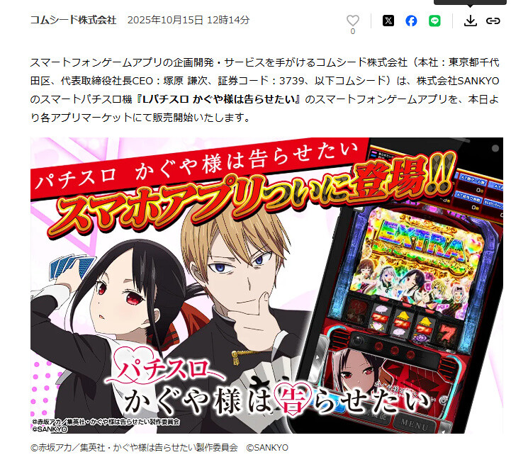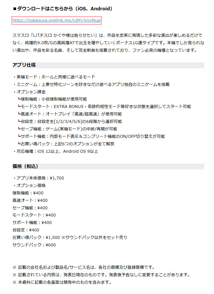 【朗報】スマホアプリ「Lパチスロ かぐや様は告らせたい」の配信がスタート お値段は本体1700円、お買い得パック1500円、サウンドパック600円