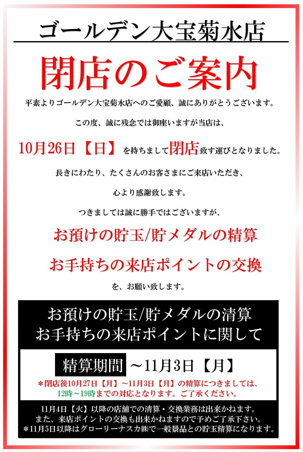 北海道札幌市白石区菊水元町3条1丁目6番26号にある「ゴールデン大宝 菊水店」が10月26日の営業をもって閉店へ