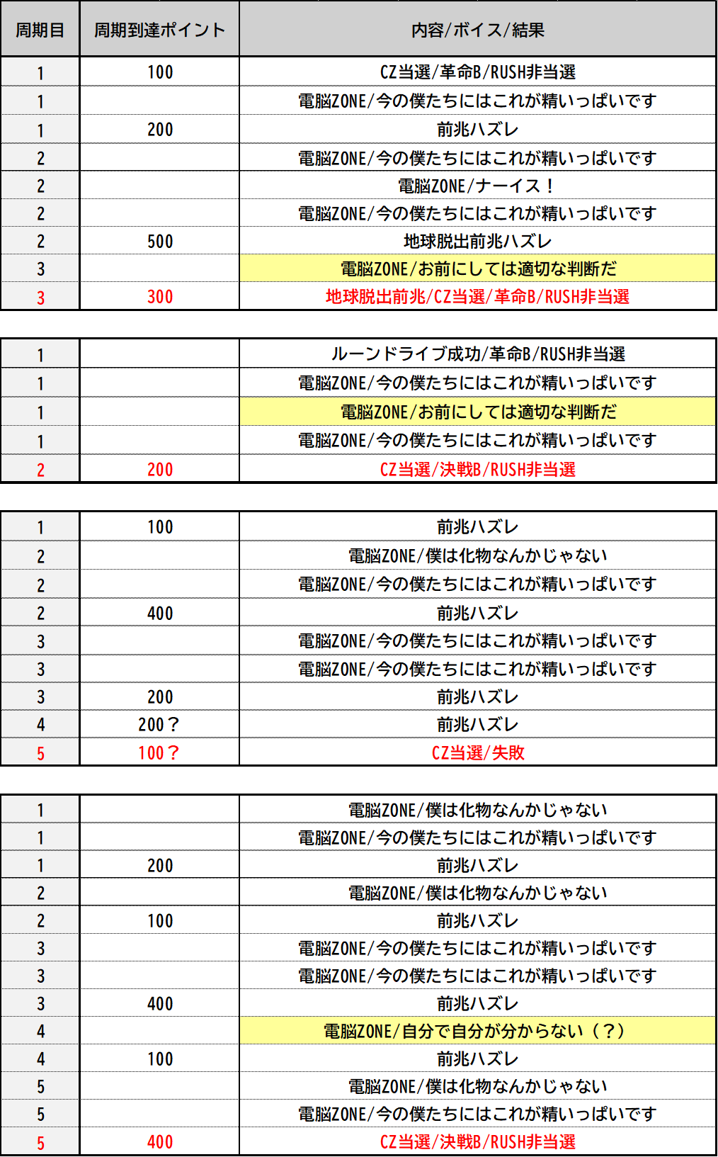 2台打って僕はRUSH取れなかったのでひたすら通常チェックしてましたが、電脳ZONE終了時のボイスに注目してみました。黄色はその日あんまり聞くことが少なかったものを色塗りしてます。… https://t.co/6mxIEazznE pic.twitter.com/FjmnqCECV6