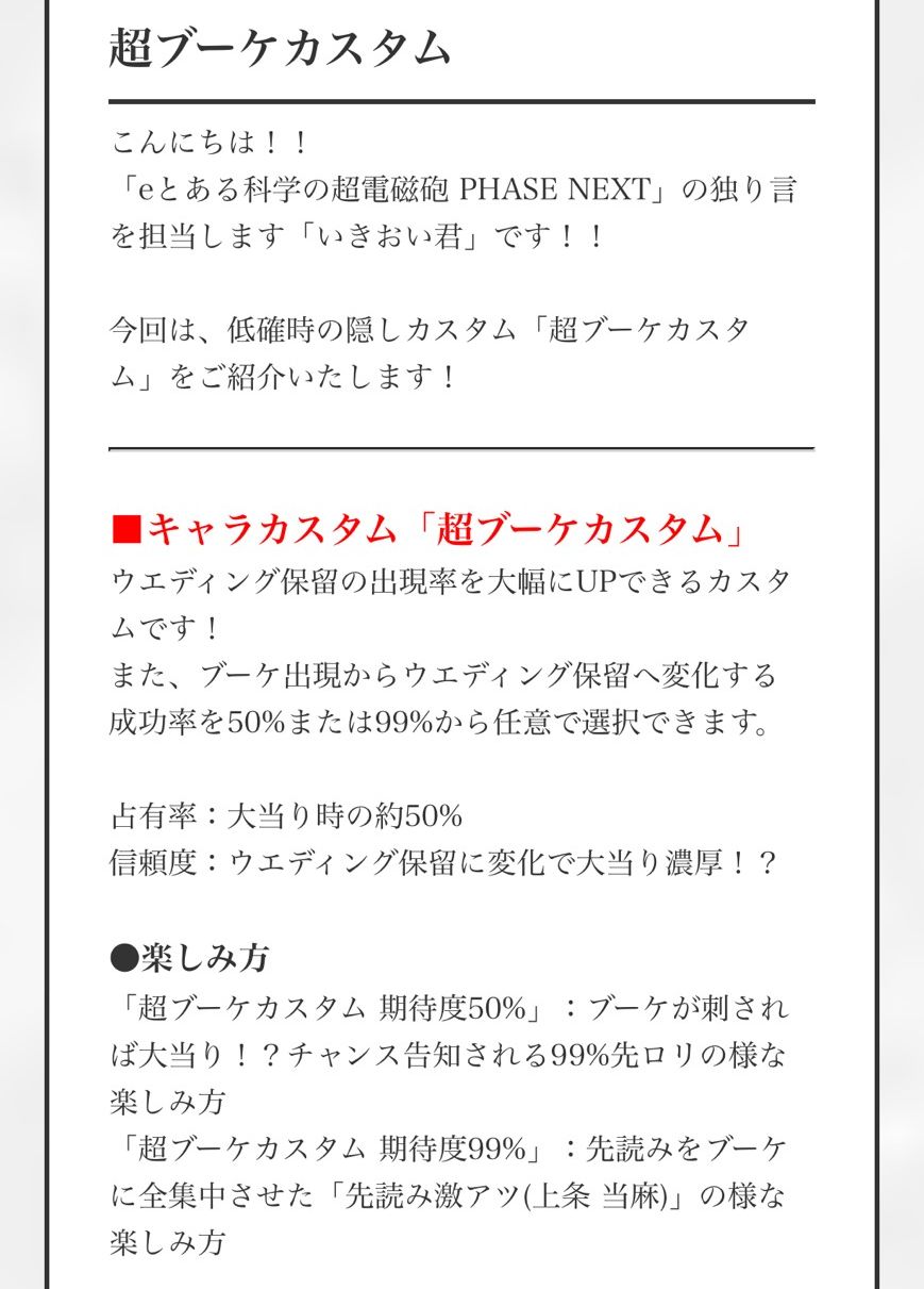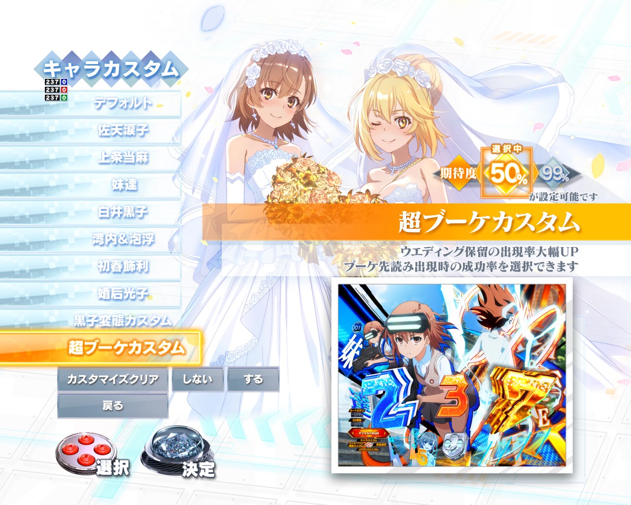 【朗報】藤商事開発ボイスにてスマパチ超電磁砲の隠しカスタム「超ブーケカスタム」の情報が公開!ウエディング保留出現率が50%、99%から選べるようになるぞ!