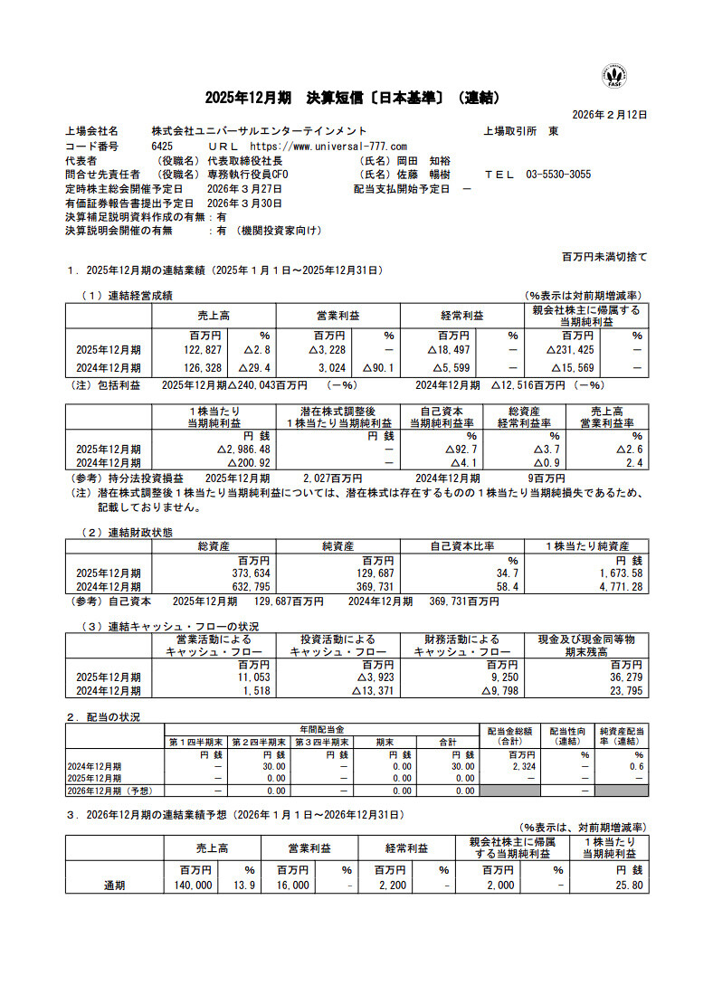 株式会社ユニバーサルエンターテインメントの2025年12月期(2025年1月1日〜2025年12月31日)決算情報の要点は以下の通りです。