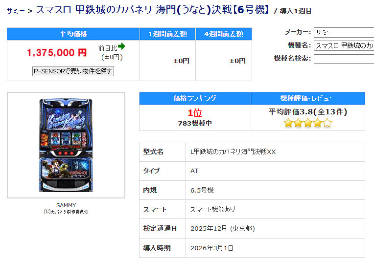 【大覇権確定】L甲鉄城のカバネリ海門決戦、初動はスマスロ全機種中トップを記録 中古機価格は既に140万円弱に